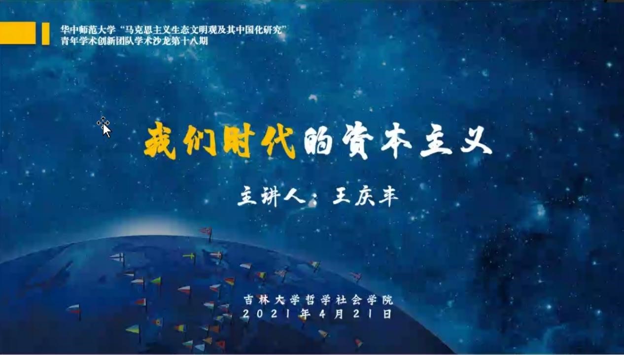 马克思主义学院讯(通讯员 马雪梅)2021年4月21日晚七点,华中师范大学“马克思主义生态文明观及其中国化研究”青年学术创新团队学术沙龙第十八期顺利举行。本次讲座采取腾讯会议的形式,由吉林大学哲学社会学院教授、博士生导师王庆丰主讲“我们时代的资本主义”,华中师范大学马克思主义学院副教授戴圣鹏主持,校内外二百余名师生线上聆听了本次讲座。